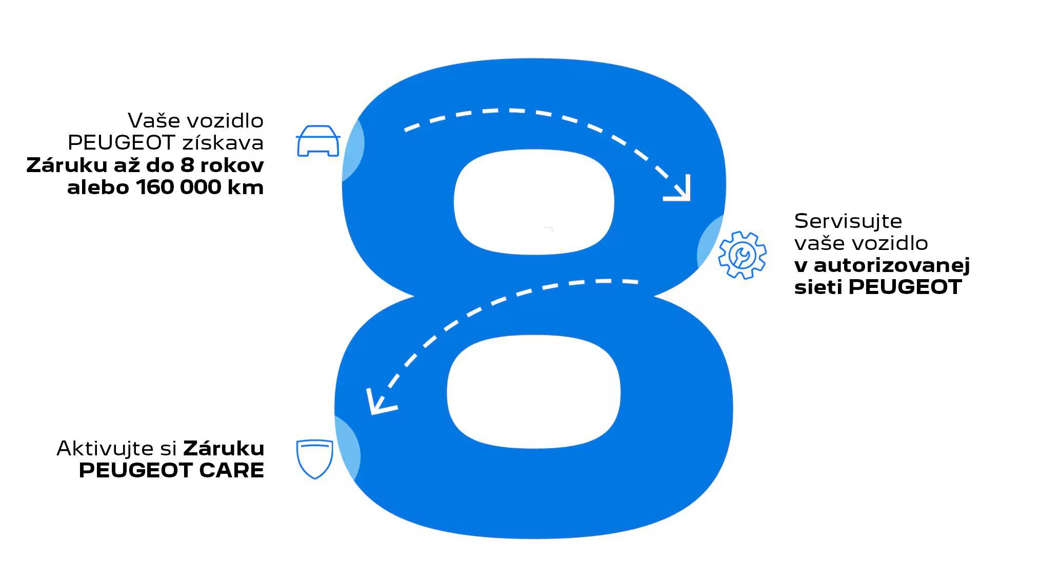 Vaša záruka PEUGEOT CARE platí do nasledujúcej plánovanej servisnej prehliadky, s maximálnou dobou trvania 8 rokov alebo do 160 000 km, podľa toho, ktorá z týchto hraníc nastane skôr, a v súlade s podmienkami programu .
