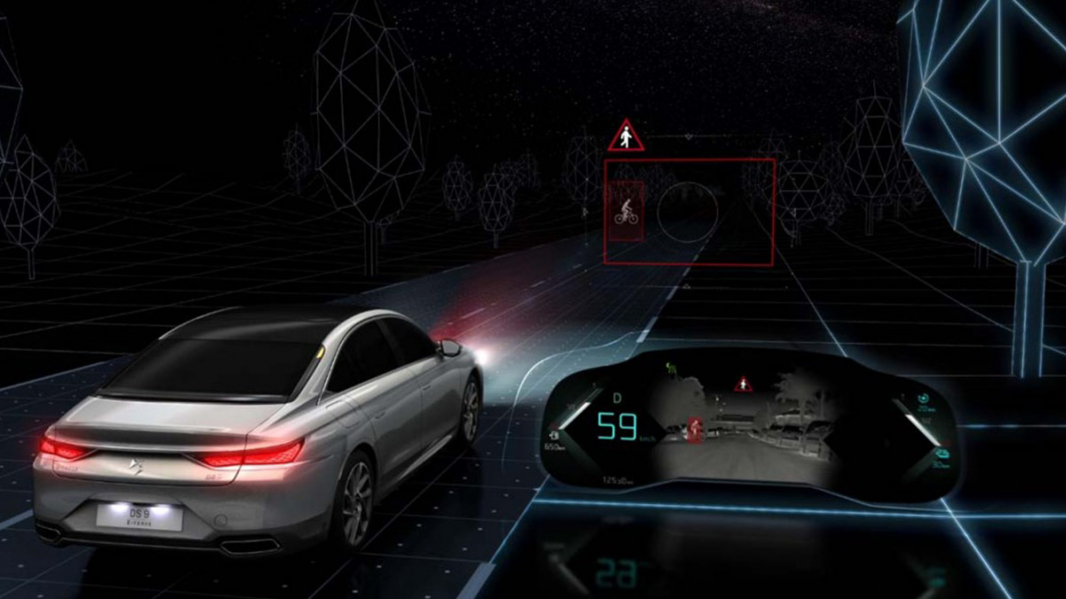 Vďaka neviditeľnej infračervenej kamere umiestnenej v prednej maske chladiča skenuje vaše vozidlo DS 9 vozovku v reálnom čase. Systém je schopný zistiť prítomnosť chodcov alebo zvierat na vozovke do vzdialenosti až 100 metrov, aby ste mohli predvídať nebezpečie a vedeli rýchlo na možné nebezpečie reagovať.